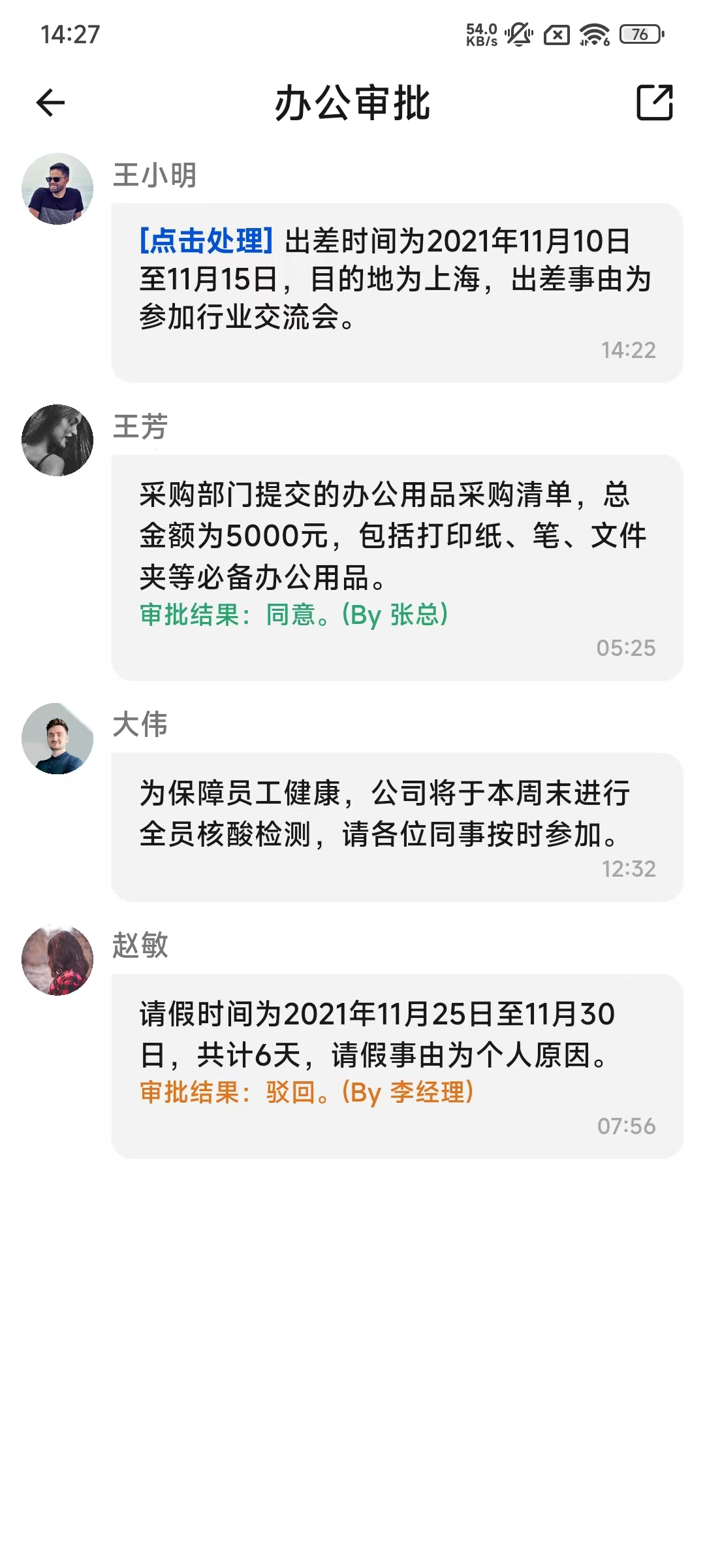 'content' => '为保障员工健康,公司将于本周末进行全员核酸检测,请各位同事按时参加。',