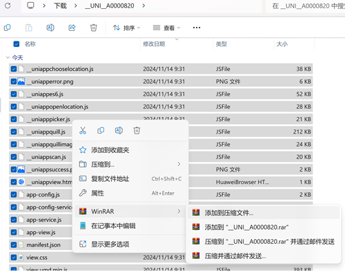 解压后会得到一个目录,双击进入目录。按 Ctrl + A 全选,然后右键 WinRAR,添加到压缩文件。