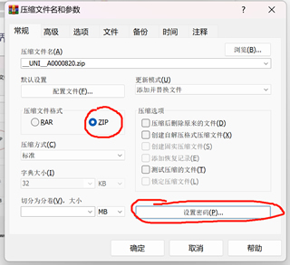在弹出来的压缩界面中,压缩文件格式选择【zip】,然后点击【设置密码】。