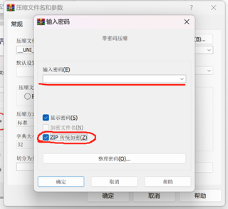 在输入密码界面中,输入密码(输入你的zip文件密码,即是应用密码),然后勾选上【ZIP 传统加密】项。